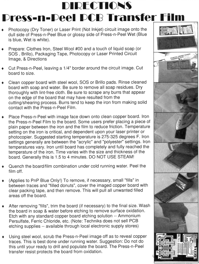 Press-N-Peel Directions Guide how to use the Press-N-Peel PCB transfer material. banzai_pnpblue.gif 307 KB View Download Choose files or drag and drop files Tags: Was this article helpful? Yes No Olaf Nobis Posted Updated PostShare on Facebook Comments Comments are disabled for this article